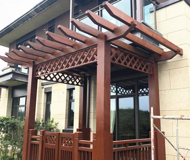 像這樣的防腐木結(jié)構(gòu)一般業(yè)主的要求都比較高,不只要做的好看,而且涂刷之后的質(zhì)感,手感,視覺都要比較好。圖中的這個類似于防腐木花間的外廳就是使用水性漆加水性色漿涂刷的效果,這個是用噴槍噴涂的。所以看上去顏色較深飽滿度好。一般室外要做顏色的話,最好是調(diào)好顏色之后用噴槍噴涂一遍或兩遍,然后再用透明的水性清漆噴涂一遍。這樣做的原因是將顏色做在下面一層,日曬雨淋的環(huán)境下能極大的延長顏色的保色性能,不會輕易褪色。